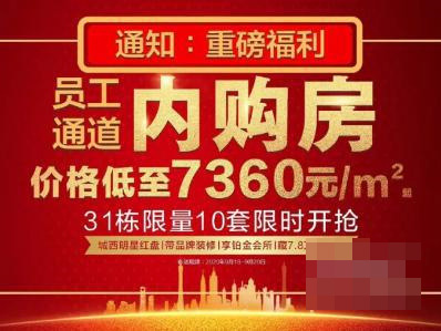 恒大城带员工通道内购房,参考价格7360元/㎡起,31栋限量10套限时开抢。活动时间:9月18日-9月20日,以上信息仅供参考,具体情况请咨询售楼处。