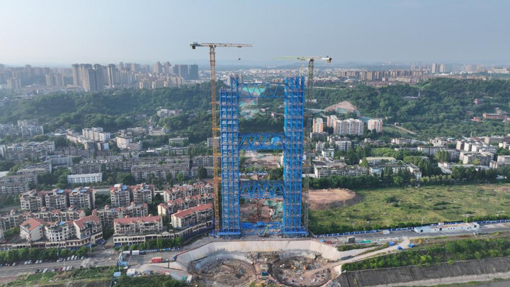 目前,泸州长江五桥的扣塔施工又取得新进展。南岸扣塔共16节,已完成13节,“身高”达到156米,距离最终的192米高度仅一步之遥;北岸扣塔共15节,现已完成12节,高度为138米,完成后高度将达174米。这些高耸的扣塔作为最重要的节点工程之一,每天都在见证着项目的点滴变化。