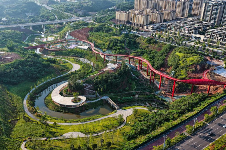 柏木溪生态公园位于江阳区云峰路两侧,规划面积约466亩。除了空中景观桥外,公园内的山体绿化、基础道路、停车场、运动场等附属设施也在同步推进,建成后将提供景观桥漫步观景、亲子互动、亲水休闲娱乐等多种体验方式。同时,公园建设还融入了“海绵城市”理念,健身步道、停车场、广场均采用透水工程,能有效缓解城市内涝问题。