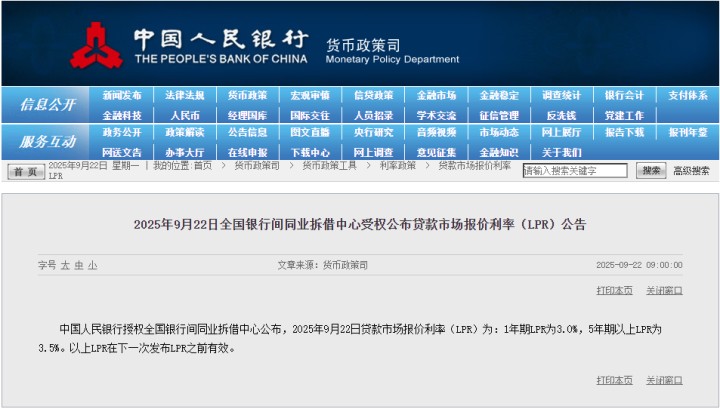 2025年9月22日,中国人民银行授权全国银行间同业拆借中心公布,2025年9月22日贷款市场报价利率(LPR)为:1年期LPR为3.0%,5年期以上LPR为3.5%。以上LPR在下一次发布LPR之前有效。