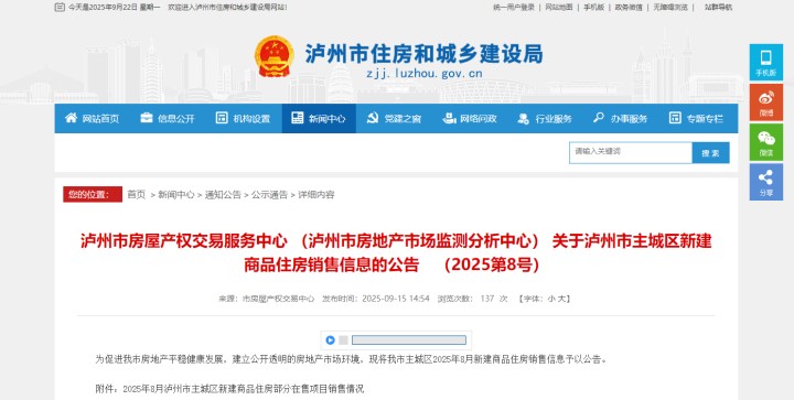 为促进房地产平稳健康发展,建立公开透明的房地产市场环境,2025年9月15日,泸州市房屋产权交易服务中心(泸州市房地产市场监测分析中心)发布了关于泸州市主城区新建商品住房销售信息的公告(2025第8号)。