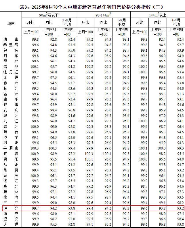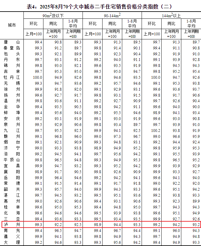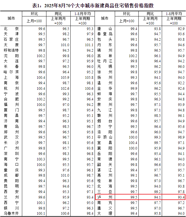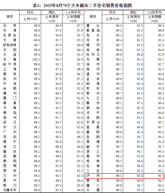2025年9月15日,国家统计局发布了2025年8月份70个大中城市商品住宅销售价格变动情况。来看看泸州房价有什么变化吧!