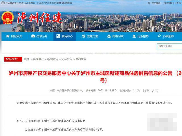 为促进房地产平稳健康发展,建立公开透明的房地产市场环境,2021年11月16日泸州市房屋产权交易服务中心发布了2021年10月泸州市主城区新建商品住房销售信息的公告。