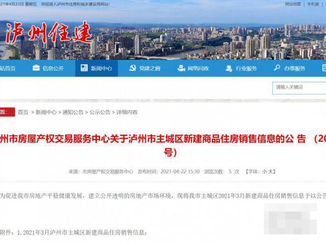 为促进泸州市房地产平稳健康发展,建立公开透明的房地产市场环境,2021年4月22日,泸州市房屋产权交易服务中心在泸州市住房和城乡建设局官方网站公布了“2021年3月泸州市主城区新建商品住房销售信息”和“2021年3月泸州市主城区新建商品住房在售项目销售排名情况”。