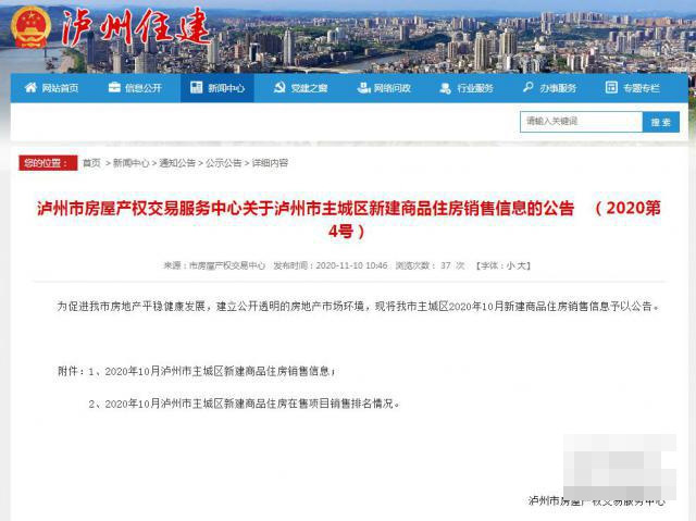 为促进泸州市房地产平稳健康发展,建立公开透明的房地产市场环境,2020年11月10日,泸州市房屋产权交易服务中心在泸州市住房和城乡建设局官方网站公布了“2020年10月泸州市主城区新建商品住房销售信息”和“2020年10月泸州市主城区新建商品住房在售项目销售排名情况”。