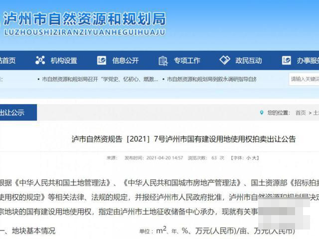 2021年4月20日,泸州市公共资源交易中心发布了泸市自然资规告[2021]7号泸州市国有建设用地使用权拍卖出让公告。