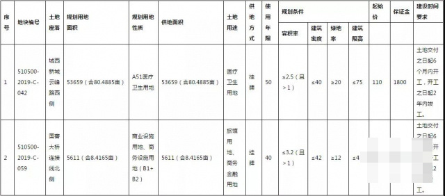 2、510500-2019-c-042号宗地在出让期限内,需要改变本合同约定土地用途的,由出让人有偿收回建设用地使用权;该宗地要求门诊、住院楼、科研实验楼等医疗建筑面积不低于72000m2,康养、恢复训练等康养建筑面积不高于50000m2,学术会议、培训中心、学员宿舍等培训后勤建筑面积不高于12000m2,建筑单体不得设计为成套型住宅。