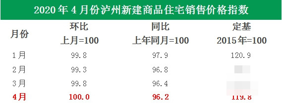 ▲2020年4月泸州新房价格变动指数