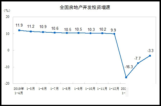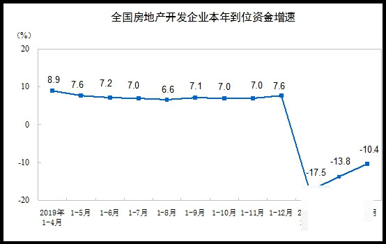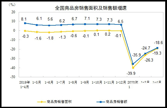 同时根据国家统计局发布的2020年1-4月份全国房地产开发投资和销售情况。数据显示1-4月份,全国房地产开发投资33103亿元,同比下降3.3%,降幅比1-3月份收窄4.4个百分点。其中,住宅投资24238亿元,下降2.8%,降幅收窄4.4个百分点。