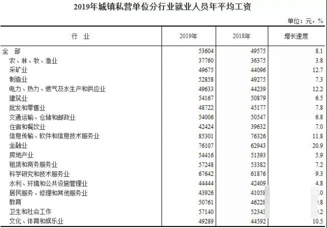 从国家统计局发布的数据显示,2019年全国城镇私营单位就业人员年平均工资为53604元,比上年增加4029元。