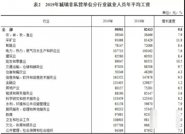 近日,国家统计局发布了2019年城镇单位就业人员年平均工资数据。