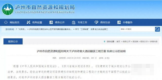 5月20日,泸州市自然资源和规划局发布关于泸州老窖大酒店翻装工程方案批前公示的说明。这也将意味着闲置多年的大酒店将重新恢复运营!