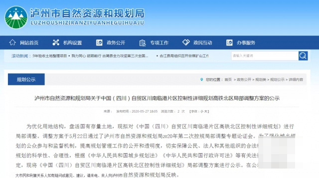 5月27日,泸州市自然和规划局发布了关于中国(四川)自贸区川南临港片区控制性详细规划高铁北区局部调整方案的公示。