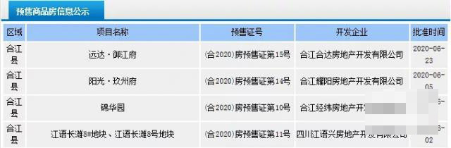根据公示显示,6月份4个取得预售许可证的楼盘均在合江县。