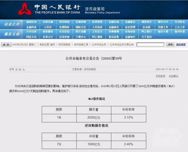 2020年2月17日,央行开展了2000亿元中期借贷便利(mlf)操作和1000亿元7天期逆回购操作。下调1年期mlf利率至3.15%;此前为3.25%。