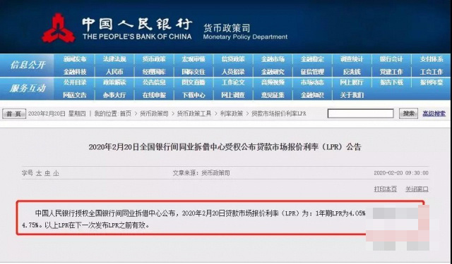2月20日,中国人民银行授权全国银行间同业拆借中心发布新一期的lpr:1年期lpr为4.05%,较上一期下降10个基点;5年期以上lpr为4.75%,较上一期利率下降了5个基点。