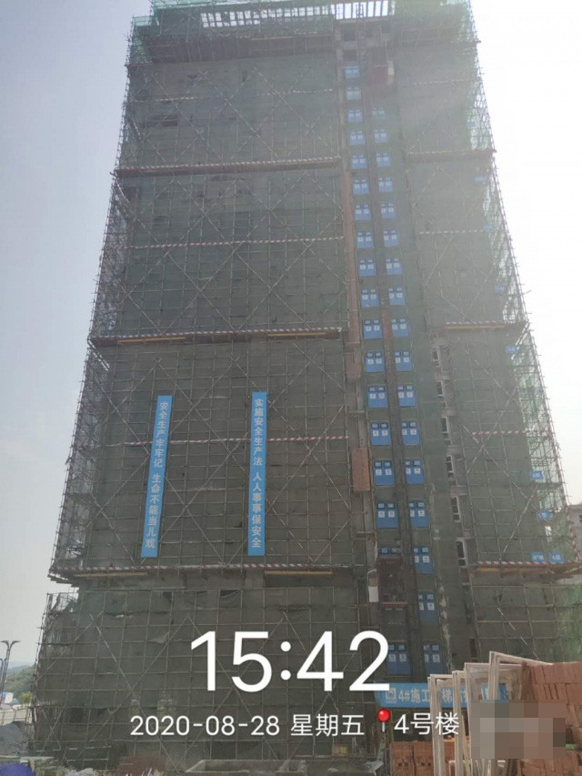 4号楼主体已封顶,砌体已完成,内墙抹灰完成至18层,外墙抹灰完成至15层。