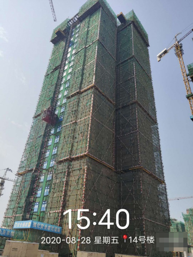 14号楼主体已封顶,砌体完成至22层,内墙抹灰施工至7层。