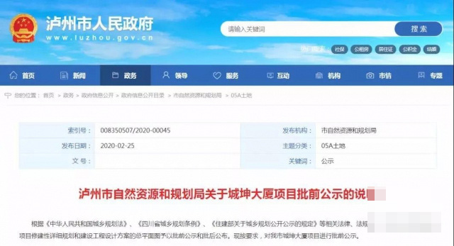 近日,泸州市自然资源和规划局发布关于城坤大厦项目批前公示说明。据了解该项目的公示期已经结束,接下来由开发商进行相关的后续工作。