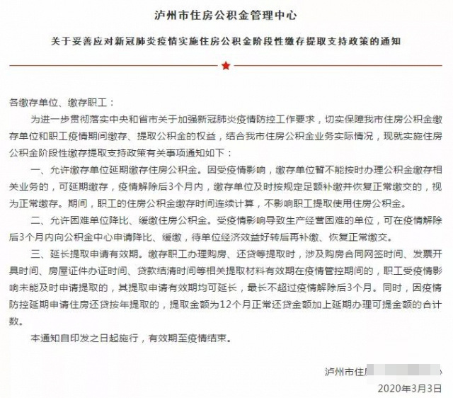 2020年3月3日,泸州市住房公积金管理中心发布《关于妥善应对新冠肺炎疫情实施住房公积金阶段性缴存提取支持政策的通知》。