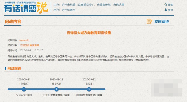 对此,江阳区教育体育局回复,金科博翠湾、翡翠滨江、酒城中心、阳光国际、蓝博湾、世贸璀璨、小区配套园均在建设中。