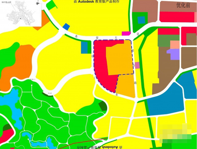 优化前: 地块内含A33中小学用地约99亩,容积率≤1.2。约98亩B1商业用地,容积率≤1.5。
