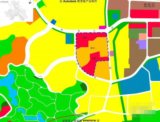优化后: 地块分为三个子地块。地块一面积约52亩,性质为商业用地,容积率≤2.0,建筑密度≤35%,建筑高度≤50米,绿地率≥10%。地块二面积约99亩,性质为中小学用地,容积率≤1.2,建筑密度≤35%,建筑高度≤24米,绿地率≥35%。地块三面积约47亩,性质为商业用地,容积率≤1.5,建筑密度≤35%,建筑高度≤50米,绿地率≥10%。