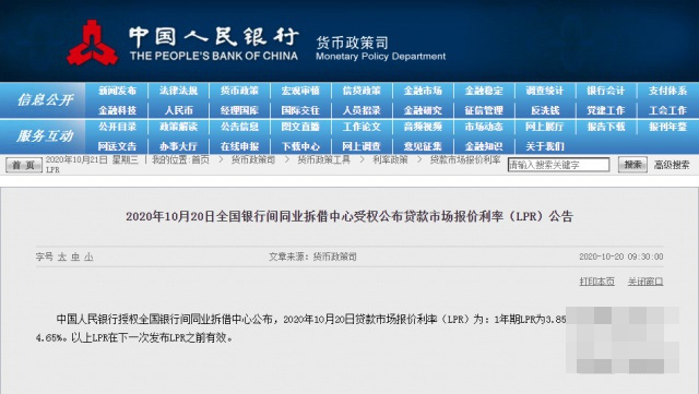2020年10月20日,中国人民银行授权全国银行间同业拆借中心公布了2020年10月份的贷款市场报价利率,具体为:1年期LPR为3.85%,5年期以上LPR为4.65%。以上LPR在下一次发布LPR之前有效。从公告数据中可以看到,最新一期(10月份)LPR与上期LPR(9月份)保持一致。这也是今年4月以来连续6个月LPR报价持续保持“按兵不动”。