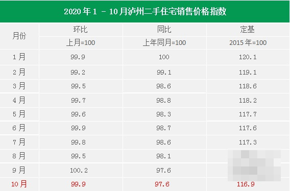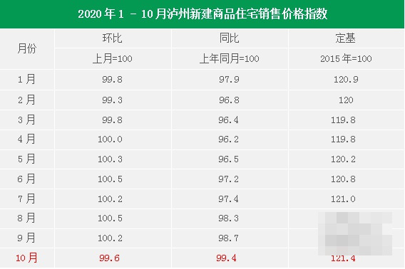 以下是泸房汇根据国家统计局发布的数据,整理出2020年1-10月泸州新建商品住宅(以下简称“新房”)及二手住宅(以下简称“二手房”)的销售价格变动情况统计数据,仅供参考。
