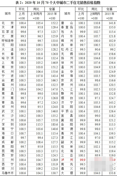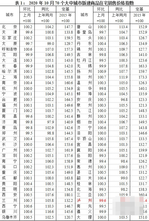 2020年11月16日,国家统计局发布2020年10月份大中城市商品住宅销售价格变动情况统计数据。