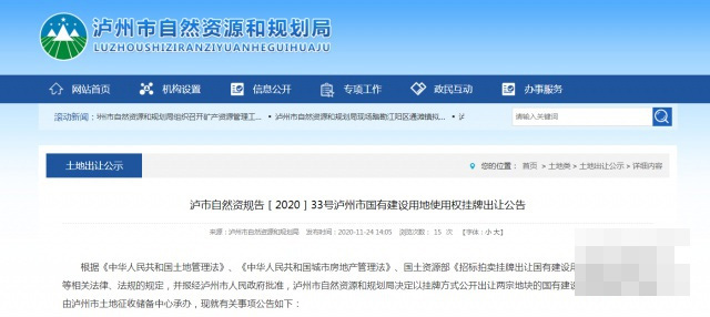 2020年11月24日,泸州市自然资源和规划局发布了泸市自然资规告[2020]33号国有建设用地使用权拍卖出让公告。