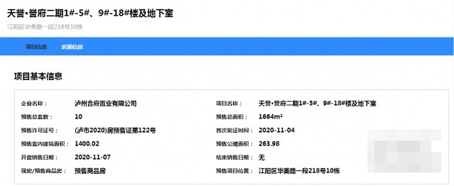 泸州合府置业有限公司天誉·誉府二期项目取得预售房源共计10套,预售总面积1664㎡。