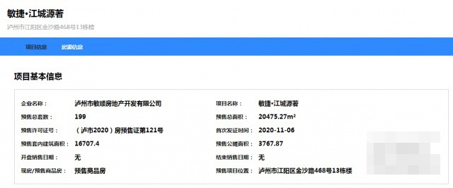 泸州市敏顺房地产开发有限公司敏捷·江城源著项目取得预售房源共计199套,预售总面积20475.27㎡。