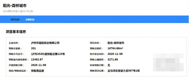 泸州晟阳置业有限公司阳光•森林城市项目取得预售房源共计201套,预售总面积16764.66㎡。