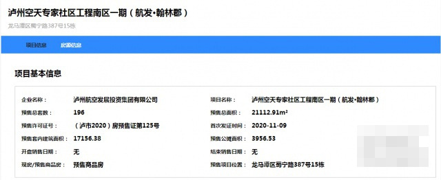泸州航空发展投资集团有限公司航发·翰林郡项目取得预售房源共计196套,预售总面积21112.91㎡。
