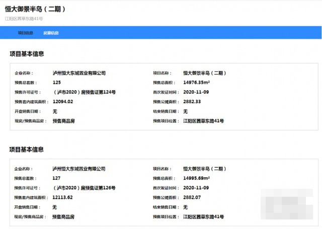 泸州恒大东城置业有限公司恒大御景半岛(二期)项目取得预售房源共计252套,预售总面积29972.04㎡。