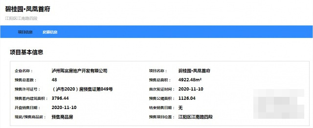 泸州赐富房地产开发有限公司碧桂园·凤凰首府项目取得预售房源共计48套,预售总面积4922.48㎡。