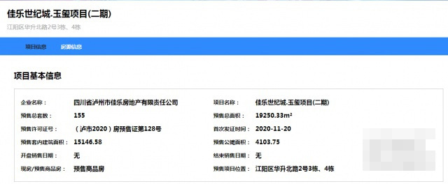 四川省泸州市佳乐房地产有限责任公司佳乐世纪城·玉玺(二期)项目取得预售房源共计155套,预售总面积19250.33㎡。