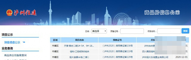 据泸州市住房和城乡建设局官网显示,12月1日当天,泸州主城区有3个项目取得了预售许可证。