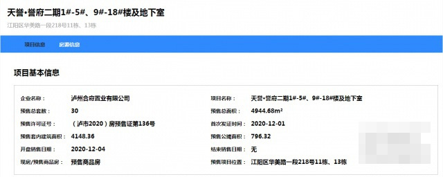 泸州合府置业有限公司天誉·誉府二期项目取得预售房源共计30套,预售总面积4944.68㎡。