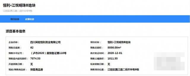 四川昊阳恒利置业有限公司恒利·江悦明珠项目取得预售房源共计62套,预售总面积8886.08㎡。