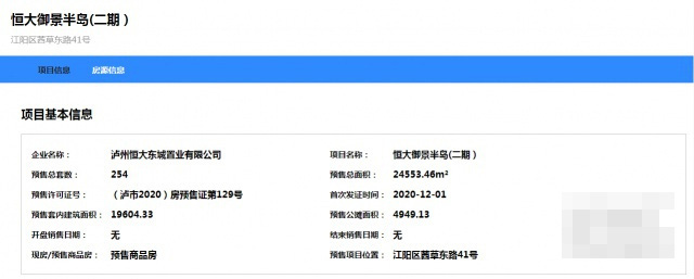 泸州恒大东城置业有限公司恒大御景半岛(二期)项目取得预售房源共计254套,预售总面积24553.46㎡。