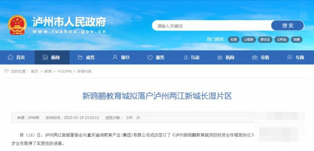 3月17日,两江新城管委会与重庆渝洲教育产业(集团)有限公司成功签订了《泸州新鸥鹏教育城项目投资合作框架协议》,对推动项目落地和进一步合作取得了实质性的进展。