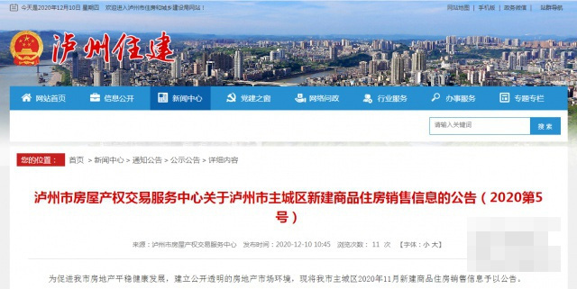 为促进泸州市房地产平稳健康发展,建立公开透明的房地产市场环境,2020年12月10日,泸州市房屋产权交易服务中心在泸州市住房和城乡建设局官方网站公布了“2020年11月泸州市主城区新建商品住房销售信息”和“2020年11月泸州市主城区新建商品住房在售项目销售排名情况”。