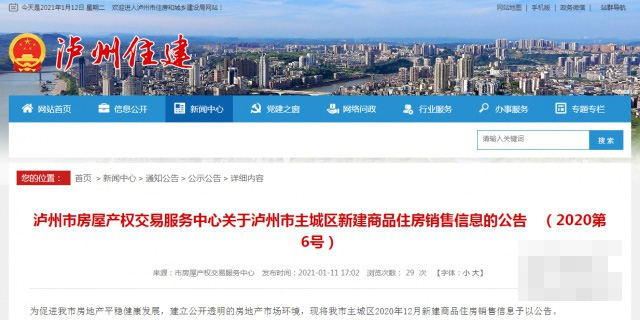 为促进泸州市房地产平稳健康发展,建立公开透明的房地产市场环境,2021年1月11日,泸州市房屋产权交易服务中心在泸州市住房和城乡建设局官方网站公布了“2020年12月泸州市主城区新建商品住房销售信息”和“2020年12月泸州市主城区新建商品住房在售项目销售排名情况”。