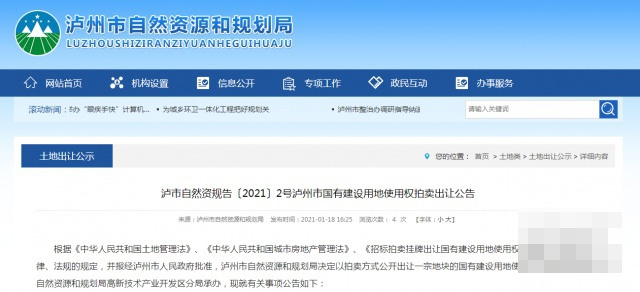2021年1月18日,泸州市自然资源和规划局发布了泸市自然资规告〔2021〕2号泸州市国有建设用地使用权拍卖出让公告。