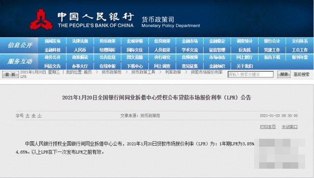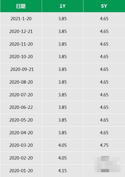 2021年1月20日,中国人民银行授权全国银行间同业拆借中心公布了2021年1月份的贷款市场报价利率(LPR)为:1年期LPR为3.85%,5年期以上LPR为4.65%。
