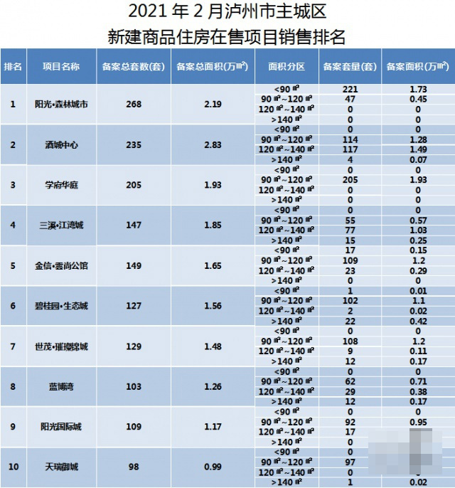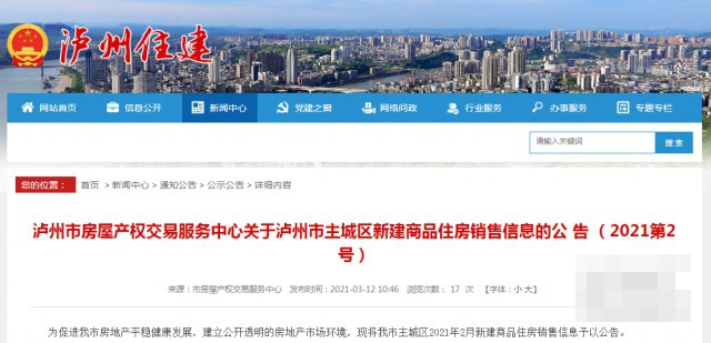 为促进泸州市房地产平稳健康发展,建立公开透明的房地产市场环境,2021年3月12日,泸州市房屋产权交易服务中心在泸州市住房和城乡建设局官方网站公布了“2021年2月泸州市主城区新建商品住房销售信息”和“2021年2月泸州市主城区新建商品住房在售项目销售排名情况”。