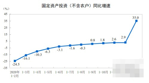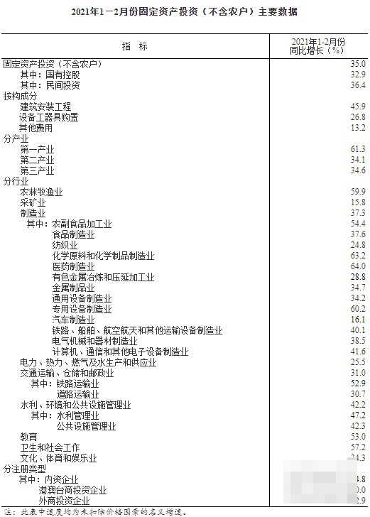 1—2月份,全国固定资产投资(不含农户)45236亿元,同比增长35.0%;比2019年1—2月份增长3.5%,两年平均增速为1.7%。其中,民间固定资产投资26183亿元,同比增长36.4%。从环比速度看,2月份固定资产投资(不含农户)增长2.43%。