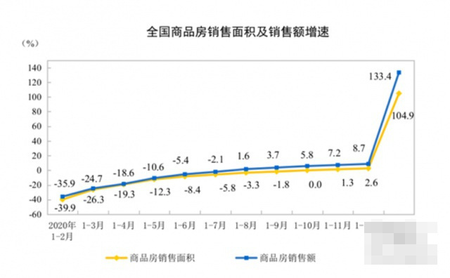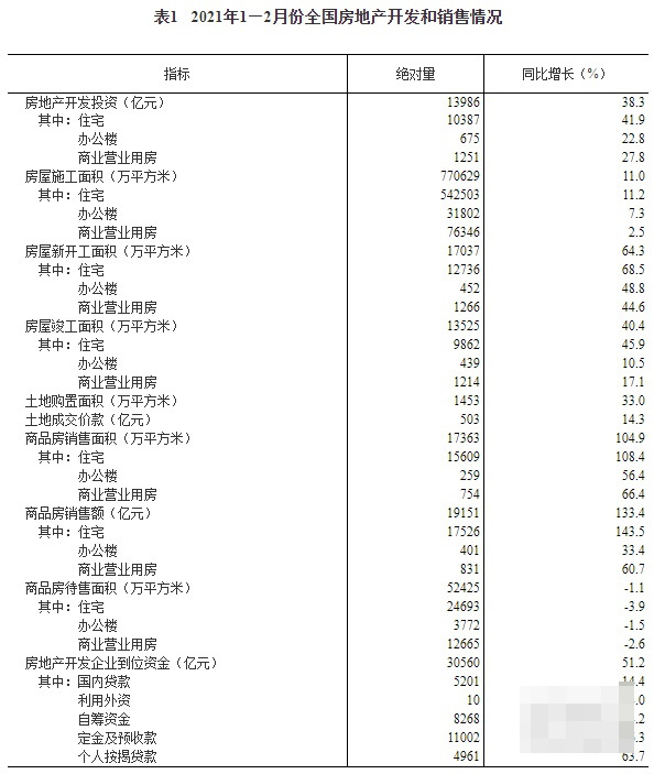 1—2月份,商品房销售面积17363万平方米,同比增长1.05倍;比2019年1—2月份增长23.1%,两年平均增长11.0%。其中,住宅销售面积增长1.08倍,办公楼销售面积增长56.4%,商业营业用房销售面积增长66.4%。商品房销售额19151亿元,增长1.33倍;比2019年1—2月份增长49.6%,两年平均增长22.3%。其中,住宅销售额增长1.44倍,办公楼销售额增长33.4%,商业营业用房销售额增长60.7%。